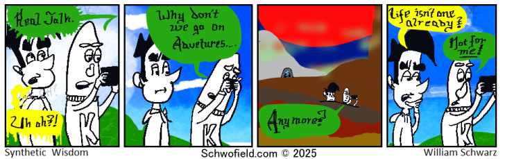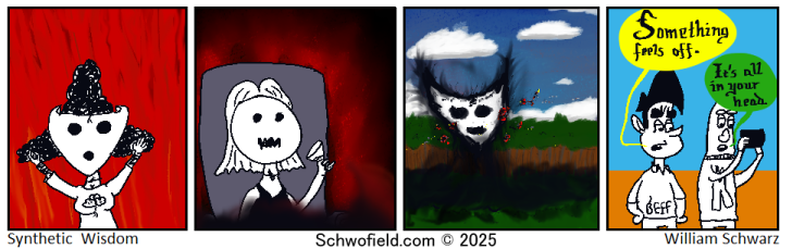 Thank you all for staying with me. I do know I had a bit of a dry spell. Again, I don’t like writing too many posts without having a Comic. How long have I been doing this? 22 or so years? I think it began in 2003 when I first started drawing Sans Merit. I had another comic afterwards a short lived Penny Arcade clone. I think Synthetic Wisdom started around 2009. 16 years. I thought I might have to stop, but it wasn’t the comic that needed to end, it was some mentality around it.